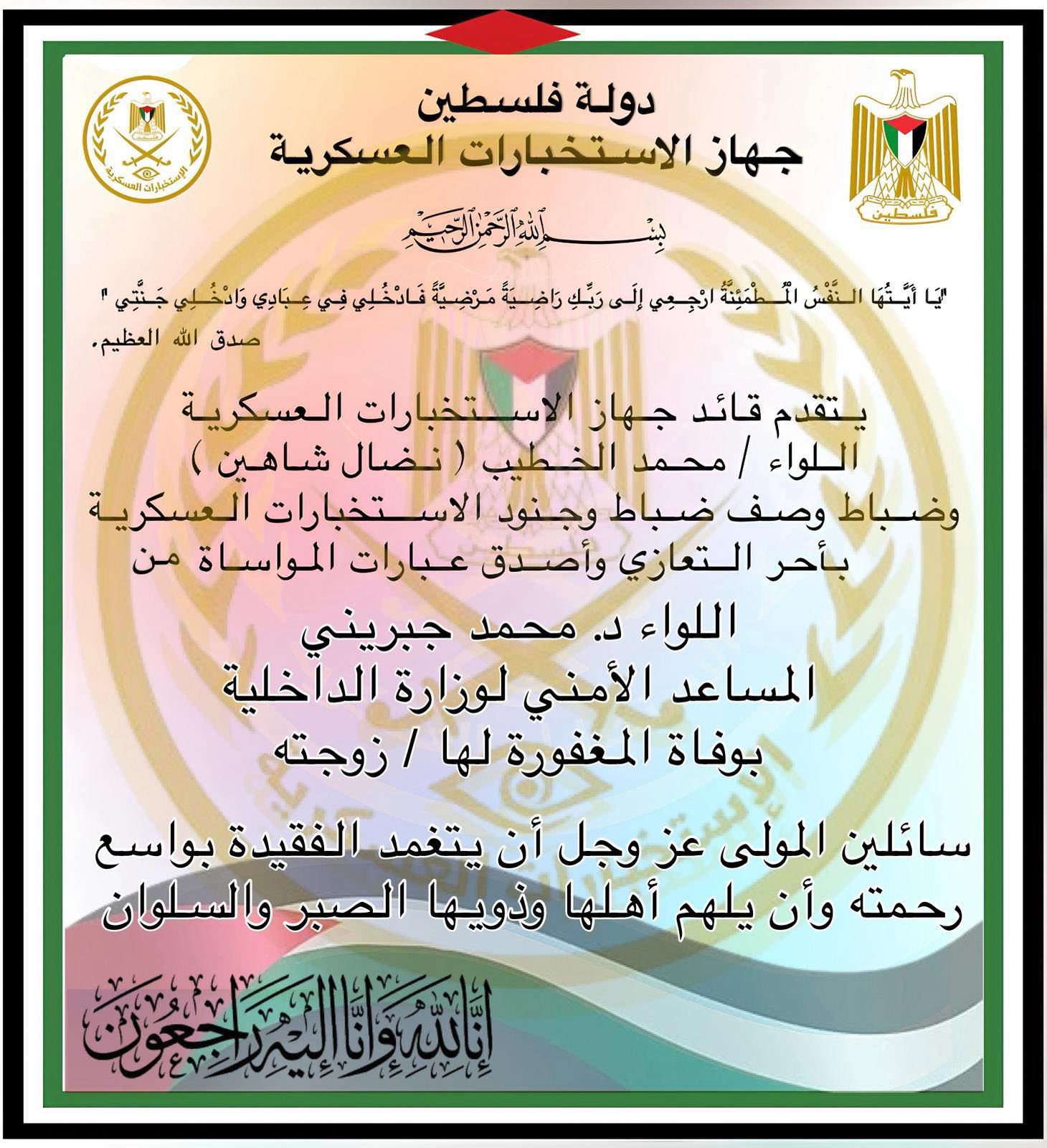 أكمل القراءة »بسم الله الرحمن الرحيم “كلُّ نَفْسٍۢ ذَآئِقَةُ ٱلْمَوْتِ ۗ وَإِنَّمَا تُوَفَّوْنَ أُجُورَكُمْ يَوْمَ ٱلْقِيَٰامةِ ” صدق الله العظيم